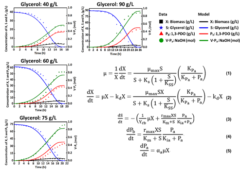 Time course of 1,3-PDO batch fermentation in mathematical model and experiment with different concentration of glycerol