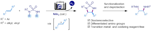 徐海超课题组对电化学促进的烯烃双官能团化反应进行了深入研究,该课题组蔡晨燕同学前期通过电合成方法实现了烯烃与二醇的脱氢环化反应(Nature Communications, 2018, 9, 3551),为饱和氧杂环提供高效合成途径。在此基础上,课题组实现了烯烃与磺酰胺的脱氢环化反应,通过进一步脱除磺酰基成功实现了高非对映选择性和区域选择性的烯烃双胺化反应,为1,2-二胺类化合物提供高效、简便的合成方法。使用单取代的磺酰胺为原料可制备具有两个不同胺基的二胺化合物。该工作通过有机电子转移催化剂与电的结合避免了过渡金属催化剂和氧化剂的使用,且增强了底物和官能团的兼容性。