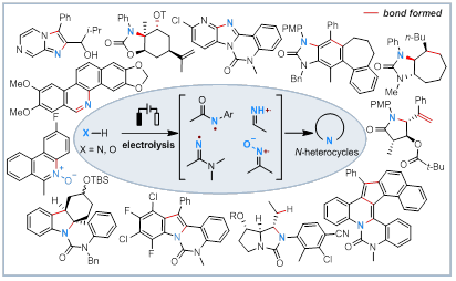 有机电合成利用电促进反应进行,可避免使用化学氧化还原试剂,是一种绿色的合成工具。虽然有机电合成研究可追溯到19世纪三四十年代报道的Faraday和Kolbe电解,其在有机合成中的应用依然较少。徐海超课题组自成立以来对有机电合成方法和技术进行了深入研究,近几年,课题组重点攻关电化学促进的自由基反应,即利用电氧化,以稳定、易得的N–H、C–H键及烯烃为前体,开发了高效、可控形成具有重要合成应用价值的氮、硫、碳自由基及烯烃自由基正离子的新方法。利用这些活性中间体实现了一系列以往方法难以进行的高选择性电氧化偶联反应,为多种重要结构提供高效、绿色合成新方法。该综述对电化学促进的氮自由基反应的研究进行了总结,系统介绍了通过电氧化形成氮自由基的原理、方法及其合成应用。