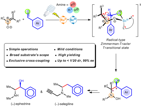 课题组在前期工作基础上,发展了路易斯酸和光催化剂协同催化的硝酮与芳香醛的自由基偶联反应,发现该反应与二碘化钐参与的硝酮与醛(酮)的自由基偶联反应在反应适用性和反应机制上具有互补性。首次实现了具有C2对称性的冯氏配体(手性N,N’-双氧化物)在光催化自由基还原反应中的应用,克服了叔胺氧化物易被还原的问题,高效地实现了邻(羟)氨基醇化合物的高非对映立体选择性和高对映选择性合成。此外,课题组与吕鑫教授课题组合作,系统研究了催化反应的机理,提出了自由基型的Zimmerman-Traxler 过渡态反应模型,并通过对照实验和计算进行验证,合理地解释了反应的催化循环过程和立体选择性机制。最终,应用该方法,经两步反应高效地实现了(+)-麻黄碱[(+)-ephedrine]和司来吉兰[(−)-selegiline] 的对映选择性合成,后者在临床上被用于治疗帕金森症、老年痴呆和抑郁症。