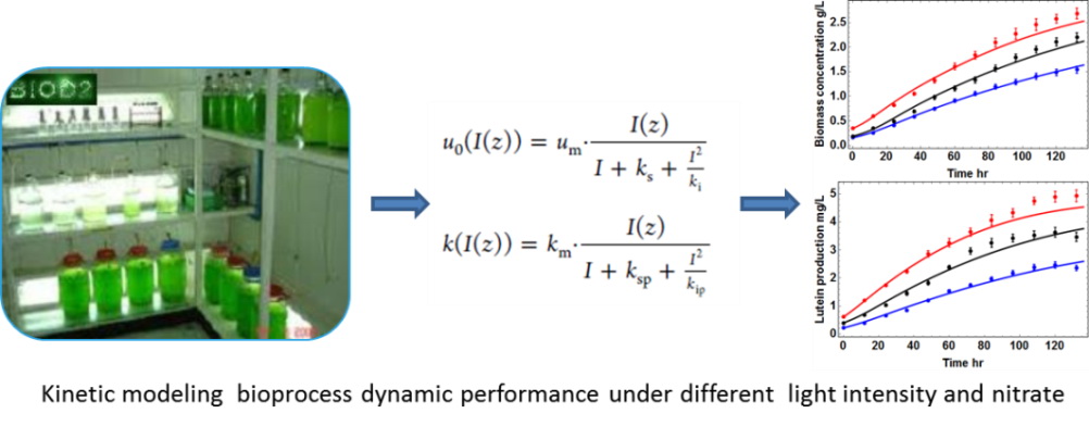 我室卢英华教授课题组与剑桥大学在光照强度和氮源浓度对栅藻生产叶黄素过程动力学模拟方面合作取得新进展,相关成果以“Kinetic modelling and process analysis for Desmodesmus sp. lutein photo-production”为题在线发表于AIChE Journal(DOI: 10.1002/aic.15667)。