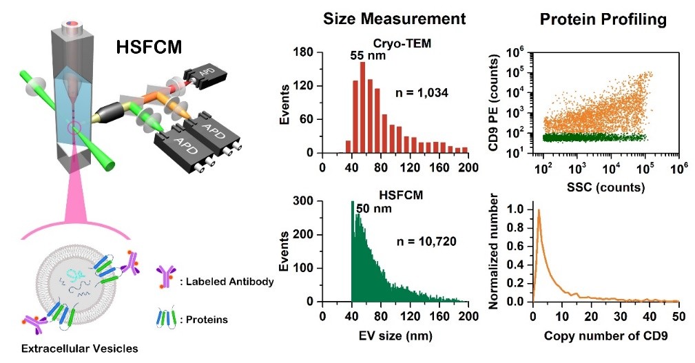 细胞外囊泡(Extracellular vesicles, EVs)是一种由细胞释放到细胞外基质中的纳米尺度的膜性小囊泡,参与细胞通讯、细胞迁移、血管新生和肿瘤生长等过程,广泛地存在于各种体液和细胞上清中,在疾病诊断、预后和治疗中显示出巨大的应用前景。由于EVs的粒径及其携载的蛋白、核酸、脂类等“货物分子”随细胞来源、细胞状态以及分泌途径的不同而存在高度的异质性和多样性,因此亟需发展一种单颗粒水平的高通量、多参数定量分析技术,以揭示EVs的个体差异,鉴定发挥重要作用的EVs亚群。然而,绝大多数EVs的粒径小于100 nm,特异性蛋白的表达量极低且异质性大,对其在单颗粒水平进行多参数定量检测一直存在诸多挑战。