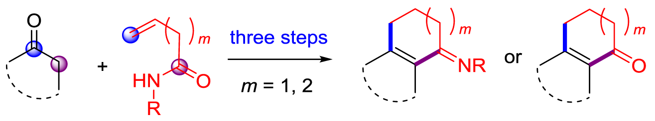 在《中国化学》第四期,我们刊登了福建省化学生物学重点实验室黄培强课题组的一个新工作。该文报道一种从环酮和末端烯烃-酰胺出发经三步以“[2+n]”的方式构建官能化并合碳环的方法。该法以Suzuki偶联和黄培强课题组发展的酰胺还原烯基化反应为关键反应,可方便地构建含á,â-不饱和亚胺或á,â-不饱和烯酮的双环(6/6, 6/7, 8/7)和三环(6/6/6, 6/6/7, 6/5/7)体系。高效构筑含七元环的并合碳环体系是该法的一个亮点。多种类型的含七元环并合碳环体系广泛存在于天然产物中。由于该环合方法兼具底物普适性和灵活性,高产率以及反应条件温和等特点,可望成为全合成中十分有价值的工具。