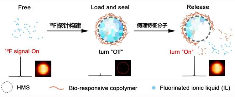 近日,高锦豪教授课题组发展了一种基于含氟离子液体的19F-MRI探针,通过模块化设计对多种生物特征目标物的实现响应成像。他们将中空介孔二氧化硅纳米颗粒(HMS)分散于熔融态离子液体中,离子液体装载入HMS的空腔并原位包裹响应聚合物。该策略巧妙地选择具有合适熔点的离子液体,通过液—固两相转化,使离子液体既作为负载物也作为溶剂,实现了高负载率和稳定性。更为重要的是,被负载在探针中的离子液体,由于分子运动受限,表现出明显的横向弛豫增强效应,横向弛豫时间(T2)由自由状态的4.5 秒缩短到负载状态的0.1 秒,导致19F磁共振信号强度大幅下降,19F磁共振信号处于“关”的状态。当探针处于特定环境(生物特征目标物,如病理特征分子基质金属蛋白酶MMP等)时,聚合物包裹层降解,所负载的离子液体释放到溶液中,T2恢复, 19F磁共振信号处于 “开”的状态。这种 “关-开”响应的多功能19F磁共振探针实现了活体水平生命体系多种特征分子的原位实时灵敏的19F磁共振成像与可视化,为19F-MRI的发展开拓了新方向。