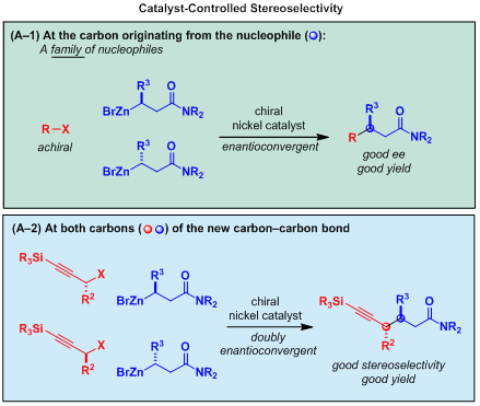 霍浩华博士在美国加州理工学院的博士后导师Gregory C. Fu教授课题组先前发展了基于外消旋烷基亲电试剂的立体汇聚反应。然而,从外消旋的亲核试剂出发实现催化不对称偶联是该方向十多年来未能很好解决的科学难题。霍浩华博士在Fu实验室从事博士后研究期间,设计合成了beta-酰胺有机锌试剂作为外消旋的亲核试剂,高立体选择性实现了非手性亲电试剂与外消旋亲核试剂的烷基-烷基交叉偶联(A-1),并进一步推广至基于外消旋亲核试剂与亲电试剂的烷基-烷基双立体汇聚反应(A-2)。该反应用1个手性催化剂,控制碳碳键形成时相连2个手性中心的选择性构建,实现4个对映体(外消旋体)的立体汇聚反应,这是交叉偶联反应概念上的重大突破。此外,此类反应表现出很好的底物适用性和官能团兼容性。值得一提的是,该工作成功采用我院黄培强教授课题组发展的酰胺活化方法学(ef 28:Tetrahedron, 2015, 71, 4248)进行酰胺至酮的直接转化,展示了相关产物的应用前景。