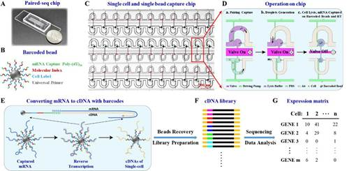 针对上述挑战,杨朝勇教授课题组开发了一种全新的高通量单细胞转录组测序新方法(Paired-seq)。Paired-seq通过将高效单细胞捕获操控微流控芯片与DNA编码微珠技术相结合,一次测序即可完成对成百上千个单细胞转录组的同时分析,解决了单细胞转录组测序存在的关键难点。首先,该工作设计了一种基于差异流阻原理及微阀微泵控制的高效单细胞/单微珠捕获与操控的微流控芯片,可实现对痕量细胞样本的高效率单细胞捕获。其次,Paired-seq利用DNA编码技术,使每个细胞内的基因带上独一无二的细胞标签和分子标签,实现对大量单细胞同时操控测序,通过标签信息对不同细胞来源的信息进行区分,保证每个细胞转录组信息的独立性,同时通过分子标签对mRNA分子表达量进行数字化统计,从而消除了序列差异导致的扩增偏差。此外,该芯片集成了微阀微泵结构,实现微量反应体系的主动快速混合、交换以及对单细胞的清洗,提高了细胞的裂解效率并有效地清除了溶液中背景游离RNA,大大降低了游离RNA的污染。最后,皮升级单细胞反应腔体极大地提升了RNA分子的局部浓度,从而实现痕量RNA分子的高效捕获与反转录扩增,提高了方法的基因检测灵敏度。与其它单细胞测序平台相比,在相同的测序深度下,Paired-seq可以检测到更多的基因,极大地降低了测序成本。基于以上系列创新的设计,Paired-seq具有细胞利用率高、灵敏度高和测序成本低的优势,为单细胞的异质性研究提供了有力的分析工具。