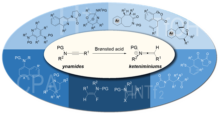 该综述对布朗斯特酸介导的炔酰胺反应进行了总结,系统介绍了炔酰胺在布朗斯特酸作用下,形成活性物种联烯亚胺阳离子(ketenimiums),进而发生系列环加成反应、环化反应、分子内烷氧化/重排反应、氧原子转移反应、氢/杂原子原子加成反应等。特别是该课题组利用手性螺环磷酰胺作为催化剂,实现了首例基于炔烃的不对称布朗斯特酸催化(手性布朗斯特酸直接活化炔烃)。在此基础上,提出了炔酰胺的新型不对称催化模式,即形成的联烯亚胺中间体与手性磷酸(磷酰胺)通过氢键和离子对作用模式进行不对称诱导。这些研究对手性布朗斯特酸催化和基于炔酰胺的不对称催化都是很好的补充。最后,该综述对布朗斯特酸催化的炔酰胺转化未来的发展趋势和前景进行了展望。