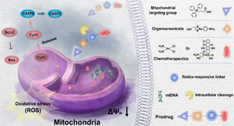 尽管化疗在癌症治疗中被广泛应用,但它仍面临着诸多的挑战,包括靶向特异性低、耐药性和不良的副作用等。基于此,高锦豪课题组设计了一种基于生物能量方法治疗癌症的方案,利用传统化疗药物和有机砷小分子化合物,构建了一系列线粒体靶向、还原响应的新型前药分子。这些前药可在线粒体内实现药物的选择性递送和控制性释放,进而在线粒体中协同促进活性氧物种(ROS)的产生,诱导线粒体DNA损伤,最终导致癌细胞凋亡。细胞实验和活体实验表明,这些前药分子在抗癌效果及药物副作用方面均优于相应化疗药物。