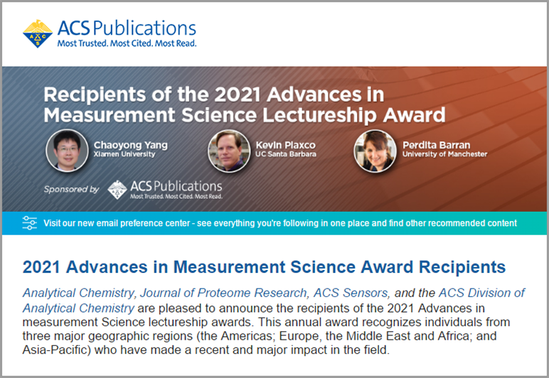 美国化学会测量科学进展讲座奖由美国化学会(ACS)旗下测量科学方面的三个主要期刊——《ACS传感器》(ACS Sensors)、《分析化学》(Analytical Chemistry)、《蛋白质组研究杂志》(Journal of Proteome Research),以及ACS分析化学分部(the ACS Division of Analytical Chemistry)联合颁发,在国际学术界拥有广泛影响。奖项旨在表彰近期在测量科学领域做出重要贡献的三名科学家,每年度在美洲、欧洲/中东/非洲、亚太地区各评出一名获奖人。杨朝勇教授是荣获该奖的第三位中国科学家。据悉,本届颁奖仪式将于2021年3月在美国新奥尔良Pittcon年会(匹兹堡分析化学和光谱应用会议暨展览会)上举行。