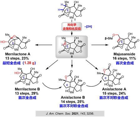 最近,福建省化学生物学重点实验室张延东教授课题组在选择性碳氢官能化促进的天然产物全合成及化学生物学研究领域连续取得重要进展,相关成果分别以“Site-Specific Photochemical Desaturation Enables Divergent Syntheses of Illicium Sesquiterpenes”为题发表于《美国化学会志》(J. Am. Chem. Soc. 2021, 143, 3256),和以“Total Synthesis of Stemarene and Betaerene Diterpenoids: Divergent Ring-Formation Strategy and Late-Stage C−H Functionalization”为题发表于《中国化学会·化学》(CCS Chemistry,DOI:10.31635/ccschem.021.202100821)。