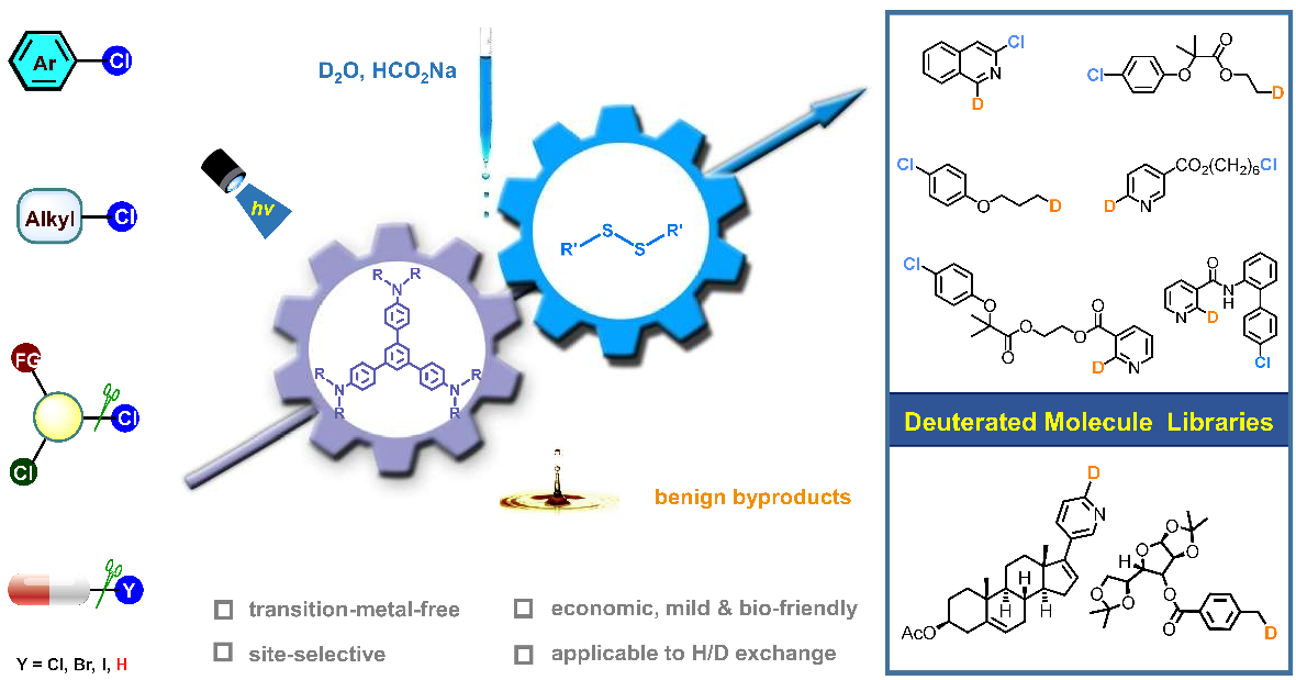 针对上述问题,课题组发展了一种共轭芳香胺和烷基二硫醚组成的有机可见光共催化体系。其中,共轭芳香胺催化剂廉价易得,激发态寿命较长,还原电势高;烷基二硫醚结构简单易调节,具有好的氘转移效率。在可见光照射、室温、空气、DMSO/D2O/甲酸钠等温和的反应条件和经济低毒的试剂作用下,成功地实现了80余种芳基、烷基氯代物的直接脱氯氘化,氘代率最高达99%,反应仅产生CO2、NaCl等副产物。