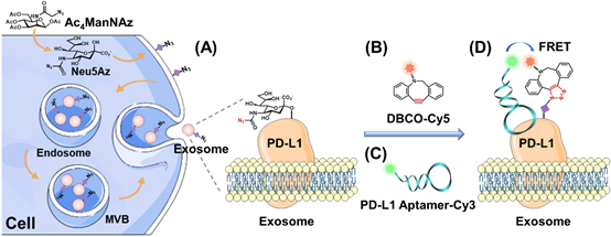 外泌体糖蛋白在众多生理和病理过程中起着重要作用。然而,现有的外泌体蛋白糖基化的研究方法需将外泌体中的蛋白分离,操作繁琐,且影响外泌体的完整性,不适用于外泌体蛋白糖基化的功能研究。因此迫切需要开发一种高效、非侵入的策略用于外泌体蛋白糖基化检测,并进一步探讨其生物学意义。