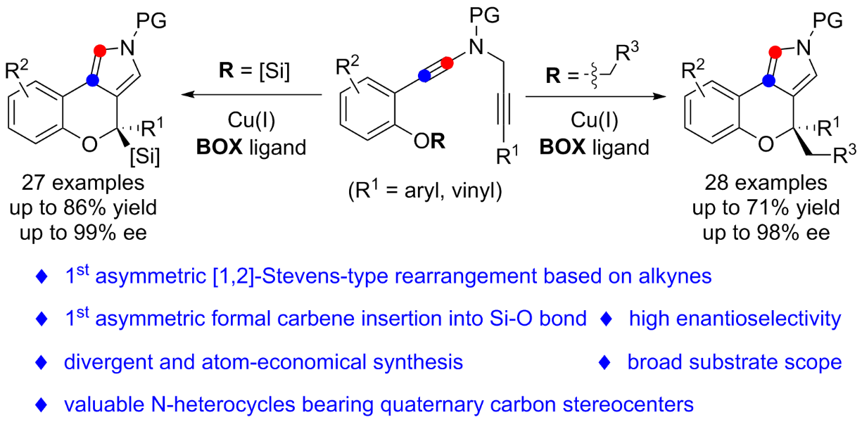 Chem. Sci. 2021, 12, 9466)的研究基础,以上海有机所唐勇院士课题组发展的带有大位阻边臂的双噁唑啉作为手性配体,成功实现了铜催化不对称1,5-二炔环化/[1,2]-Stevens类型串联重排反应。该方法具有以下特点:(1)实现了首例基于炔烃的不对称[1,2]-Stevens类型重排反应;(2)发展了首例形式上卡宾对Si‒O键的不对称插入反应;(3)多样性、原子经济性和高对映选择性地合成了含季碳手性中心的三环杂环化合物;(4)通过密度泛函理论(DFT)计算,进一步明析了该类串联反应的机理和不对称控制模式。