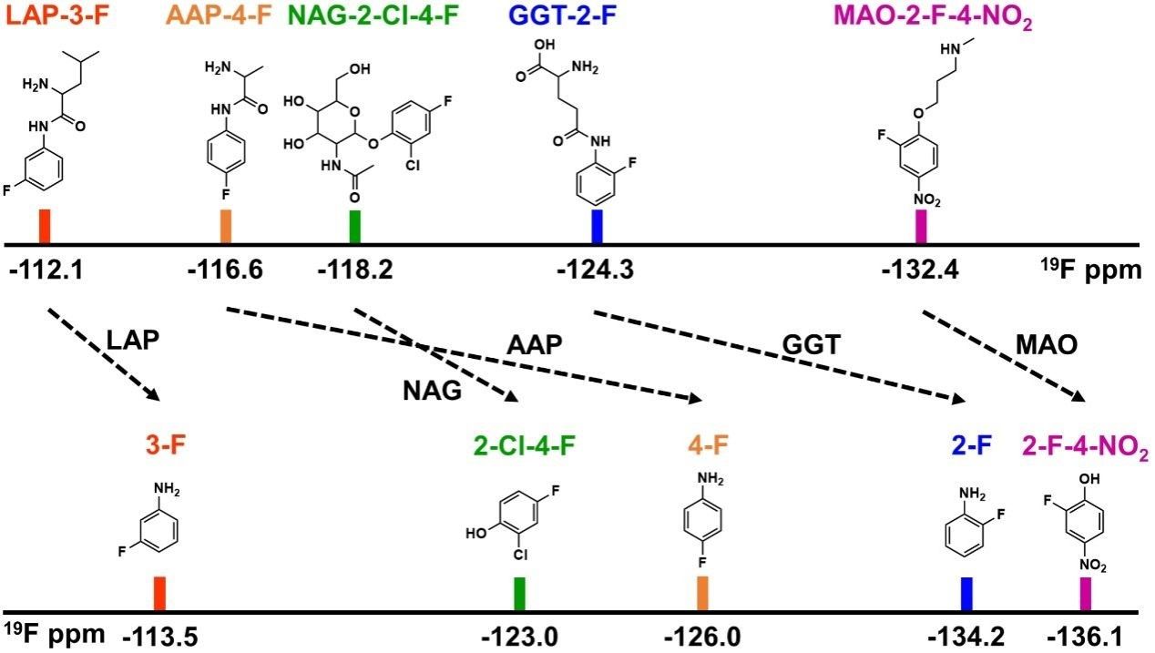 19F具有优良的磁共振灵敏度(1H的94%)、100%的自然丰度、可忽略的生物背景及可定量的信号输出。此外,19F的化学位移对其所处的化学环境非常敏感,且其化学位移的细微差别(0.03 ppm)能够被普通的400 MHz核磁共振波谱仪准确识别。因此,利用19F同时作为系列探针的编码和信号基团,有望实现复杂生物环境中多种标志物的同时定量检测。基于这些考虑,厦门大学高锦豪教授/林泓域副教授课题组通过理性设计与筛选优化,构建了一系列19F-NMR探针(LAP-3-F, AAP-4-F, NAG-2-Cl-4-F, GGT-2-F, MAO-2-F-4-NO2),在复杂生物环境中对器官损伤(肝和肾)和癌症相关的多种标志物,包括亮氨酸氨基肽酶(LAP),氨基肽酶(AAP),谷氨酰转肽酶(GGT),单胺氧化酶(MAO)和β-N-乙酰氨基葡萄糖胺酶(NAG)等,实现了同时定量检测。