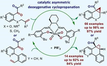近日,卓春祥教授课题组受钼酶在生物体内氧原子转移反应中的普遍应用的启发,将廉价易得、稳定的六价二氧化钼物种与手性salen配体结合起来,并通过加入膦作为温和的还原剂,现场生成具有催化活性的手性低价金属钼物种,成功实现了首例1,2-二羰基化合物的直接催化不对称脱氧环丙烷化反应。该类产生手性低价金属钼催化剂的方法相较于文献产生二价非手性金属钼脱氧试剂的方法更加安全、温和、简便,并可方便地用于不对称催化。该脱氧环丙烷化反应底物范围广、手性salen-Mo催化剂易得、操作安全简单,并成功用于一系列生物活性分子的衍生化。该策略不仅为手性环丙烷的合成提供了一条全新的、具有前景的路线,而且为手性salen-Mo催化剂在不对称催化中的应用打开了一扇新的窗口。