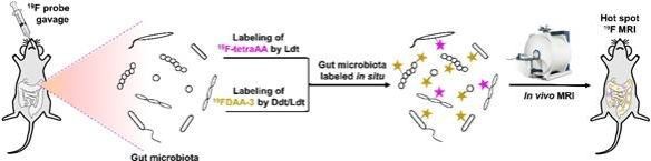 19F具有优良的磁共振灵敏度(1H的94%)、100%的自然丰度、可忽略的生物背景、可定量的信号输出及组织穿透力强等优势。此外,19F的化学位移对其所处的化学环境非常敏感,可通过设计不同19F化学位移的探针用于多通道成像。因此,利用不同19F化学位移的探针有望实现活体肠道菌群的多通道无创原位成像。基于此,课题组与合作团队将活体代谢氟标记与19F MRI相结合,设计了一种基于D型氨基酸(DAA)代谢标记对活体肠道细菌进行原位代谢氟标记(metabolic fluorine labeling,MEFLA)的策略,通过对DAA侧链修饰含19F的分子标签,再利用活体标记后肠道细菌所带的19F信号对菌群进行19F磁共振成像(19F MRI)以实时监测肠道菌群的动态变化。作为一种无创的、菌群扰动小、组织穿透力强、成像窗口长、具备多通道成像能力的菌群原位分析新方法,不仅能用于活体肠道菌群的原位成像,还能进行较为准确的定量分析,在非侵入地实时评估肠道微生物高度动态的代谢活性和空间位置方面具有很好的应用潜力。