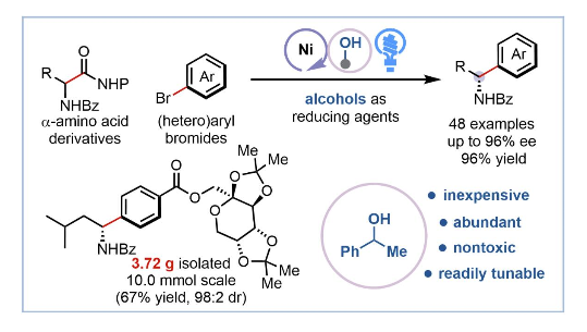 针对这一难题,霍浩华教授课题组运用他们建立的卤素自由基介导的氢原子转移(HAT)策略(JACS, 2020, 142, 19058; JACS, 2022, 144, 8797; Nat. Commun. 2021, 12, 3536; Nat. Commun. 2023, 14, 125; ACS Catal. 2021, 11, 13567.),成功驱动廉价易得的苯乙醇作为还原试剂,首次实现了a-氨基酸衍生物与(杂)芳基溴代物的高效对映选择性不对称还原偶联。该方法兼容具有挑战性(难以氧化加成)的电中性和富电子的芳基溴化物以及杂芳基溴化物,适用于大量复杂生命活性分子的后期修饰,具有出色的官能团兼容性,为手性苄胺的高效不对称合成提供了一种新的策略。系统的机理研究表明烷基自由基的可控催化形成,依赖于溴自由基介导的HAT对醇的活化,生成的羟基自由基可以在碱性条件下单电子还原a-氨基酸衍生物产生相应的烷基自由基,最终与氧化加成活化的芳基卤代物发生不对称交叉偶联。此方法中,光催化产生的羟基自由基控制烷基自由基的产生,镍催化剂活化芳基溴化物,实现了两个亲电试剂的独立调控,是实现高效不对称诱导和成功拓宽XEC芳基亲电试剂底物普适性的关键。