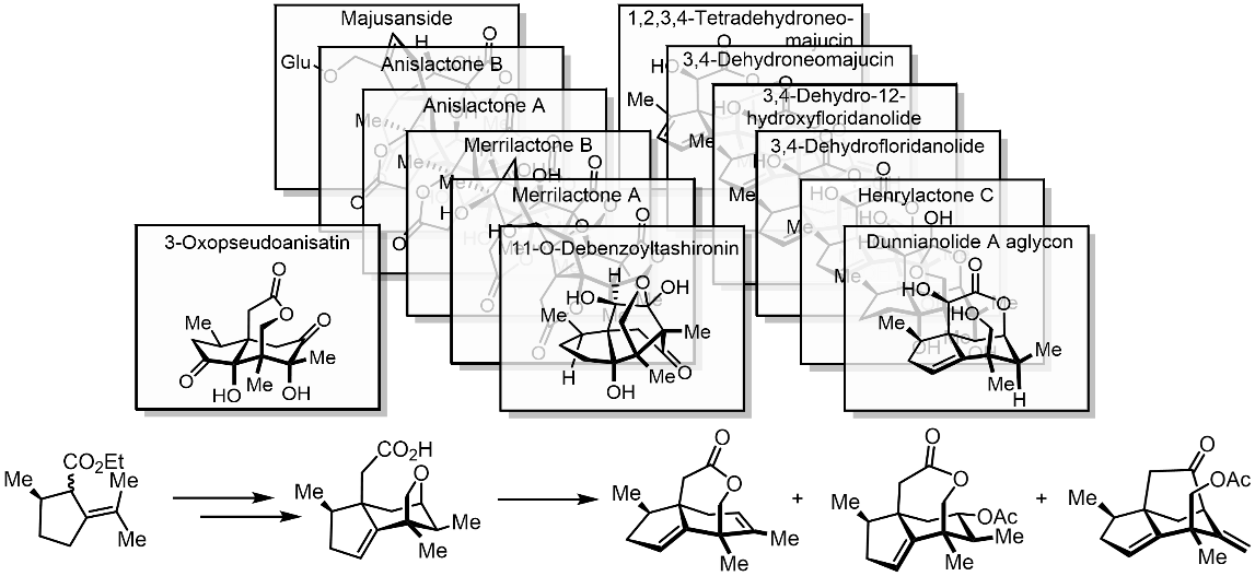 八角属倍半萜是一类从八角科植物中分离出的具有良好生物活性的天然产物,现已发现超过100种不同类型的八角属倍半萜。这些天然产物根据碳环骨架特征通常被分为seco-prezizaane、allo-cedrane、anislactone、illicinolide等不同类型,其中很多倍半萜表现出了丰富的神经营养和修复活性。然而,八角属倍半萜天然产物的家族自然丰度较低,极大地限制了相关药物的研发进程。因此,课题组希望发展通用成环策略来构建多种骨架体系,发展多种碳氢键活化策略构筑该类家族天然产物丰富的氧化态,实现该类天然产物的规模化制备,从而推动相关药物化学研究。