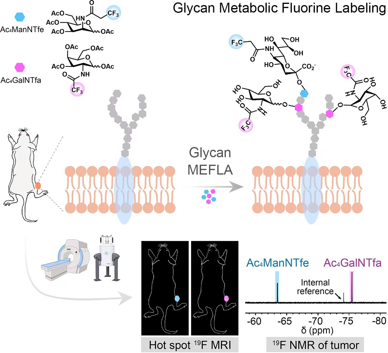 19F具有优良的磁共振灵敏度、100%的自然丰度、可忽略的生物背景、可定量的信号输出及组织穿透力强等优势。此外,19F的化学位移对其所处的化学环境非常敏感,可通过设计不同19F化学位移的探针用于多通道成像。因此,利用不同19F化学位移的探针有望实现活体内肿瘤细胞的可视化及其糖基化水平的评估。我院高锦豪教授/林泓域副教授团队设计合成了两种具有不同19F化学位移的含氟非天然单糖,Ac4ManNTfe和Ac4GalNTfa。这两种探针可被肿瘤细胞选择性摄取,随后结合到细胞表面聚糖中。该方法可对肿瘤细胞进行高效和特异性的19F标记,进而通过19F磁共振成像(19F MRI)实现了对活体内肿瘤细胞的可视化及其糖基化水平的原位评估。该研究证明了聚糖代谢氟标记策略在活体内可视化肿瘤细胞和原位评估其糖基化水平方面的巨大潜力,有望为进一步开发更有效的活体成像和生物靶标检测方法提供新思路。