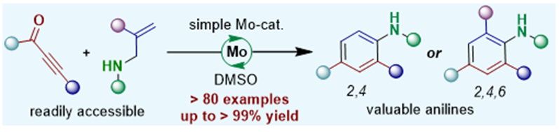 福建省化学生物学重点实验室卓春祥教授课题组在钼催化的苯胺合成反应中取得重要进展,相关研究成果以“Anilines Formation via Molybdenum-Catalyzed Intermolecular Reaction of Ynones with Allylic Amines” 为题发表于《德国应用化学》(Angew. Chem. Int. Ed. 2024, e202412299)。