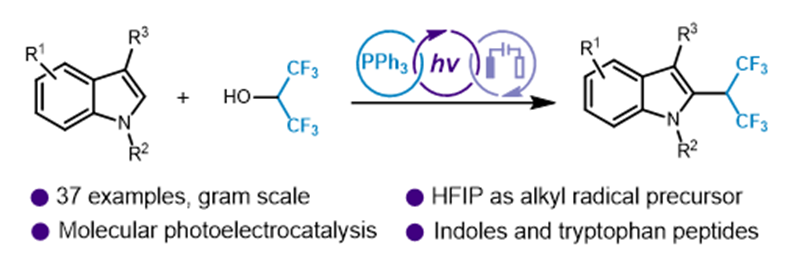 分子光电催化作为一种融合光催化与电催化的前沿催化策略,不仅能够拓展氧化还原电势范围,还可在温和电极电势下高效进行自由基反应。徐海超教授课题组长期专注于这一领域的研究,在光电催化自由基生成及光电不对称催化等方向取得了一系列开创性成果(Acc. Chem. Res. 2025, 58, 299; Nat. Catal. 2024, 7, 1250; Nat. Catal. 2022, 5, 943; Angew. Chem. Int. Ed. 2019, 58, 4592)。在本研究中,团队基于前期工作开发了光电催化活化六氟异丙醇(HFIP)的新方法,高效生成六氟异丙基自由基,从而实现对多种吲哚类及色氨酸肽衍生物的选择性六氟异丙基化。此外,研究团队还证明了该方法在规模化应用中的潜力,成功实现了克级规模的光电氟烷基化反应,为含六氟异丙基化合物的高效合成提供了一种实用的新策略。