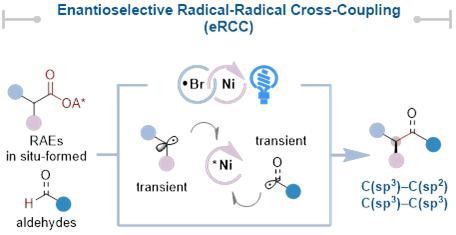 自由基-自由基交叉偶联(Radical-Radical Cross-Coupling,RCC)是一种极具吸引力的碳-碳键构筑方法,适用于医药、农药、精细化学品等高附加值三维有机功能分子的创制。然而,实现RCC反应的化学选择性和对映选择性一直是一个重大的合成科学难题。传统的RCC反应存在动力学障碍,难以实现两个自由基的选择性重组,同时控制交叉选择性和对映选择性更是极具挑战。目前有限的催化策略往往需要复杂的催化剂或特定的辅助基团来实现自由基的生成和对映选择性的控制,限制了其普适性。因此,开发一种能够独立控制自由基生成和对映选择性偶联的新催化模式具有重要意义。