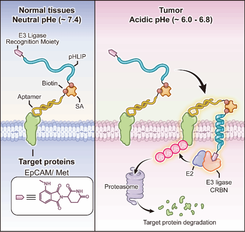 为解决上述问题,团队提出了一种利用细胞内E3泛素连接酶降解膜蛋白的新型PROTAC方法,命名为膜结合型胞内E3泛素连接酶靶向嵌合体(MembTACs)。MembTACs包含三个部分(如图):pH敏感肽段(pHLIP)仅在肿瘤微酸环境下插入细胞膜,在正常组织中保持惰性,减少副作用;pHLIP插入细胞膜内的C端为降解模块,连接小分子药物泊马度胺,将细胞内E3泛素连接酶CRBN招募至膜内侧;pHLIP的N端为识别模块,可灵活替换核酸适体或抗体,识别细胞膜蛋白。从而利用CRBN泛素化特定膜蛋白的胞内结构域实现降解。MembTACs无需细胞跨膜递送过程即可有效利用细胞内E3泛素连接酶实现肿瘤细胞膜蛋白的降解。这一策略不仅提高了降解效率,更将传统PROTAC的应用范围扩展至膜蛋白领域,有望为靶向蛋白降解技术和临床药物设计开辟新思路与应用前景。