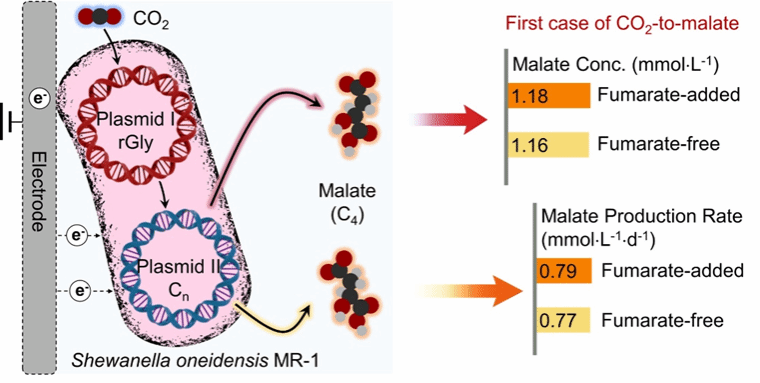 本研究工作进一步解决希瓦氏菌CO2转化为多碳效率低的难题。研究团队通过合成生物学手段在希瓦氏菌体内引入第一套质粒系统,构建还原性甘氨酸途径,结合适应性实验室进化,使其具备了甲酸同化的能力。通过引入第二套质粒系统,构建苹果酸合成路径,实现了CO2直接一步法转化为苹果酸。最终,CO2转化为苹果酸的浓度达到了1.18 mmol·L-1,这是首次通过微生物电合成直接产C4化合物。我们构建的工程希瓦氏菌电合成体系,实现将CO2可持续生物合成C2+化合物,为规模化转化CO2为长链高值产品提供了重要参考。