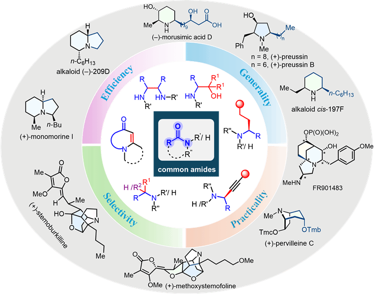 针对酰胺化学转化这一重要科学问题,黄培强教授课题组自2010年起开展了系统性研究,开发了多种高效,通用的选择性转化反应与合成方法。其中两项代表性工作被国际同行认定为相关领域的里程碑。该综述以时间轴为主线,聚焦酰胺转化中的C-C键形成,系统总结了基于三种策略发展的反应新方法及其应用。提供这一先进方法学,实现了酰胺向高附加值手性胺类化合物及含药物核心骨架杂环分子的高效转化,显著提升了含氮骨架的合成效率。文章还展示了这些方法学在复杂活性天然产物合成中的应用,并简要介绍了国内外多个研究团队把上述高效有机反应、合成方法与策略应用于其创新研究。最后,文章对酰胺化学的未来发展方向进行了讨论。