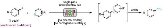 本研究发展了一种基于吡啶化–胺解策略的流动电化学C–H胺化方法。该方法在无外加化学氧化剂和金属催化剂条件下,实现了对不同电子特性芳烃(包括富电子、缺电子、卤代芳烃及杂芳环)的高效胺化,并表现出优良的官能团耐受性。此外,通过多台并联的流动反应器连续运行四天,成功制备了104 g苯胺类产物,充分展示了该方法的规模化可行性和工艺稳定性。