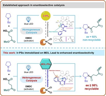 厦门大学化学化工学院汪骋教授和福建省化学生物学重点实验室霍浩华教授课题组在后修饰金属有机单层应用于Ir/Ni不对称光催化反应的研究中取得重要进展。相关成果以“Iridium Photosensitizers Immobilized on Metal-Organic Layers Lead to Enhanced Enantioselectivity in Ni/Ir Dual Photocatalysis”为题,发表于《Angewandte Chemie International Edition》(DOI: 10.1002/anie.202518424)。